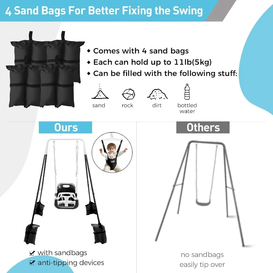 【Comes with 4 Sandbags, Much Safer】 Safety is super important when children play, and that’s why we strive to make our products safer! The stand comes with 4 sandbags, each sandbag can hold up to 11lb. You can put sand, rock or bottled water in them, and attach them to the stand feet, which will further stabilize the stand to prevent tipping. Both the swing and the baby jumper can hang on the stand, and it is sturdy and safe enough for your elder kids to play, which also liberate parents’ hands.