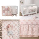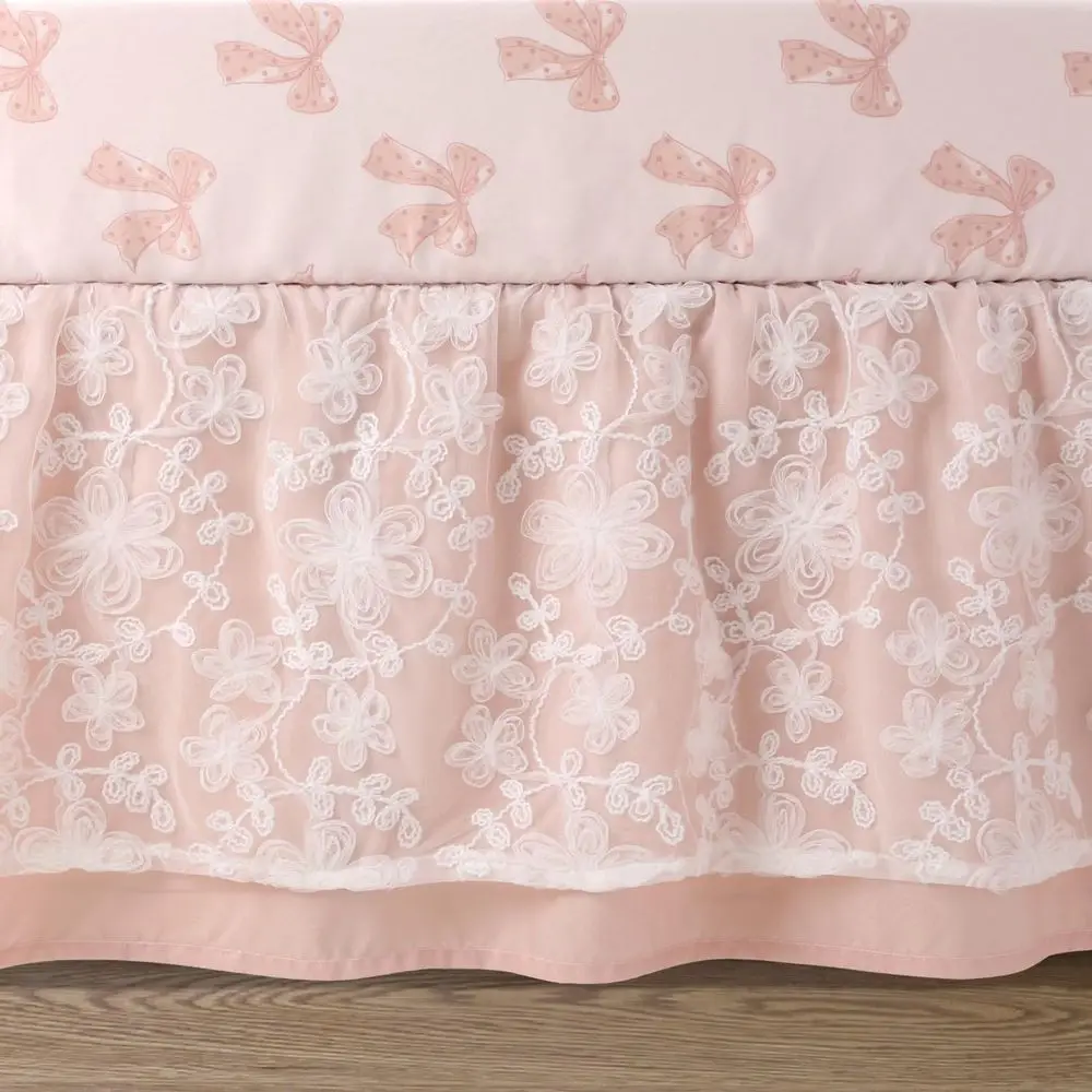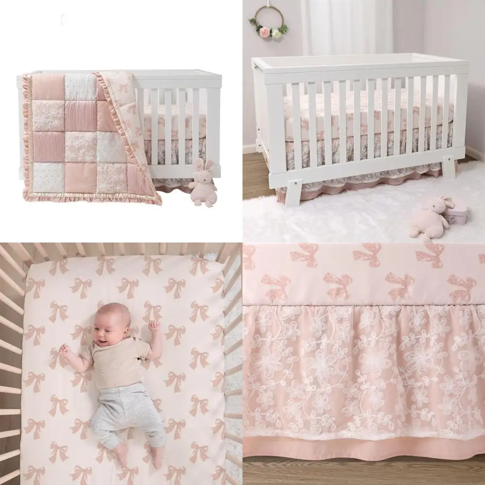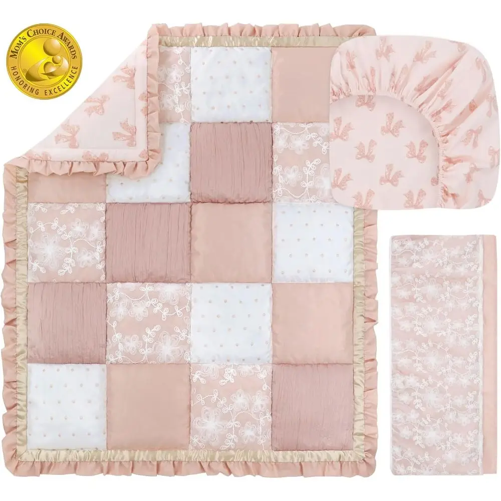Complete Baby Crib Set for Girls: This elegant patchwork quilt features a unique texture with embroidered dots, moire taffeta, crinkle satin, and a ribbon-textured floral overlay. It comes with a breathable fitted cotton crib sheet and a long layered crib skirt with a 4-sided design.