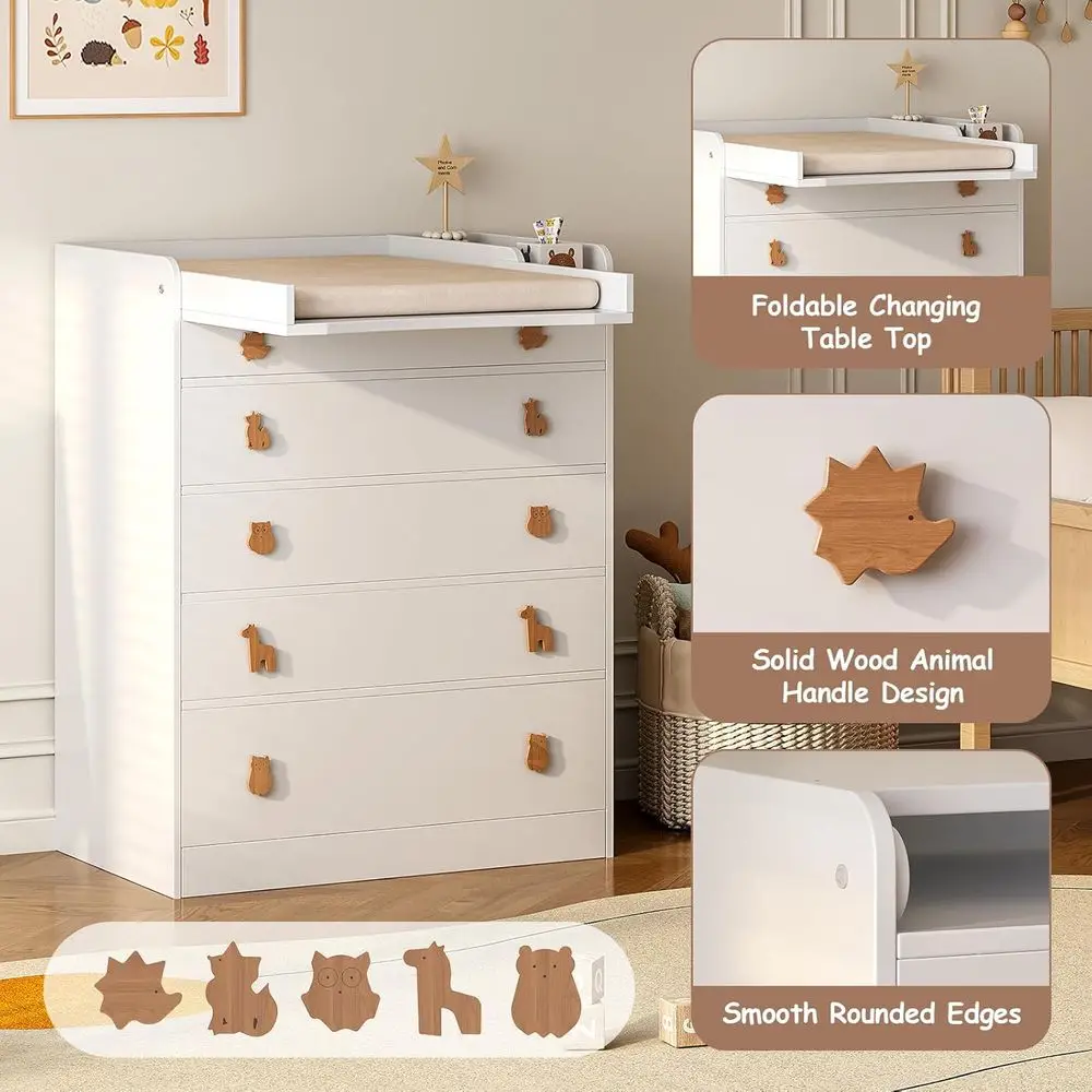 The drawer handles of this changing table feature a unique cherry wood cartoon animal handle design, adding innocence and fun to the product’s appearance. This baby dresser boasts a sleek and clean design, which can perfectly match different home schemes and tones. It is ergonomically engineered to reduce the need for parents to bend over, thereby enhancing ease of use.