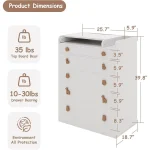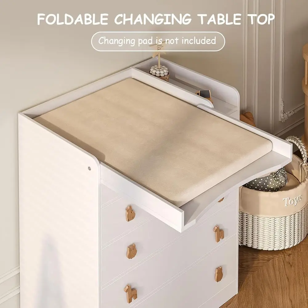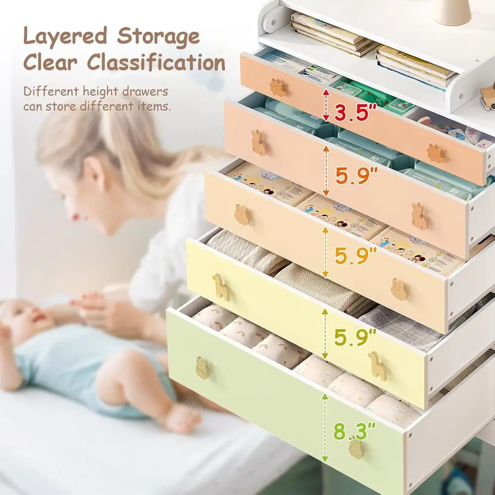 The dimensions of the changing table dresser are 39.8 x 31.6 x 18.7, offering ample room for storing toddler essentials. The baby changing table features five large drawers, ideal for organizing clothes, toys, baby skincare products, and various other items.